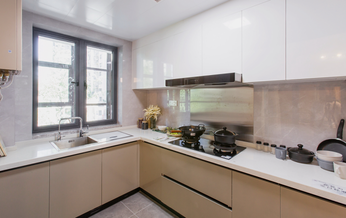 厨房设计下嵌式洗菜盆,方便清理、避免污垢;抽油烟机、燃气灶来自老板品牌;还配备飞利浦净水器、奥普凉霸、瑞士弗兰卡洗碗机等,各种设备一应俱全,让居者舒享烹饪美食的温馨时刻。