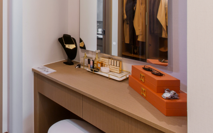 卫生间布置浴柜、镜柜,将瓶瓶罐罐照单全收;配备热牧的电热毛巾杆,自动加热,安全除菌,每个细节之处都确保美观与实用兼备。