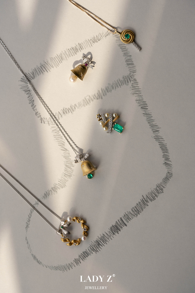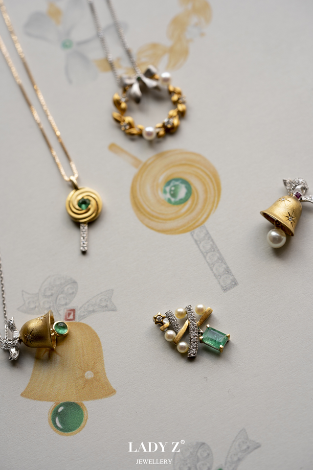 LadyZ Jewellery珠宝藉由独特的设计美学和彰显品牌引以为傲的两大核心元素——温润珍珠与神秘祖母绿以及手工工艺,留英珠宝设计师邹晨主导设计,塑造圣诞树、花环、铃铛、棒棒糖等节日布景,形成一组充满童趣的珠宝作品。